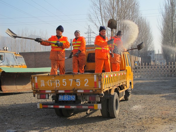 上午8:30分,總工程師王啟成宣布演練開始。接到雪情通知,養(yǎng)護工區(qū)立即通知維修隊所有成員緊急集合,并調(diào)配1臺吹雪車、2臺推雪車、2臺裝載機、2臺融雪劑播撒車、2臺灑融雪液車、1臺吹雪工具車快速部署到位,分工協(xié)作,展開除雪作業(yè)。監(jiān)控中心利用全程監(jiān)控系統(tǒng)對全路段雪情進行即時觀測,并不斷向指揮部門匯報,同時在可變情報板上及時公布雪情信息。經(jīng)過努力,路面積雪被清理干凈,保證了京張高速的全線暢通。10:50分,演練活動成功結束。