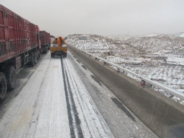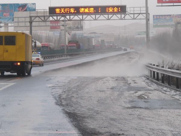 在不封道的前提下,本著“先重點(diǎn)路段,后一般路段”的原則,除雪突擊隊(duì)首先對(duì)匝道、橋梁及爬坡路段,進(jìn)行了第一次溶雪劑噴灑。隨著降雪量加大,又安排對(duì)全路段進(jìn)行了第二次灑布,同時(shí)由人工干撒融雪劑配合除雪。為防止夜晚路面結(jié)冰,突擊隊(duì)又在交警、路政部門的配合下利用吹雪車進(jìn)行吹雪作業(yè),并在個(gè)別重點(diǎn)路段加大融雪液的灑布量,以達(dá)到溶雪、溶冰的效果,徹底消除行車安全隱患。