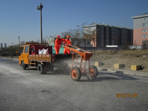 早上八點(diǎn)半,公司領(lǐng)導(dǎo)下令演練開始。在得到監(jiān)控中心雪情通知后,公司第一時間啟動除雪預(yù)案,稽查部根據(jù)命令及時在全線可變信息情報板發(fā)布除雪信息,提醒過往司機(jī)謹(jǐn)慎駕駛。所有參與除雪演練人員立即集合,各類除雪設(shè)備也跟隨到達(dá)現(xiàn)場。融雪液攪拌站立即開啟進(jìn)行攪拌并馬上裝車,融雪液灑布車隨即開出進(jìn)行噴灑。干撒作業(yè)組利用簡易干撒車裝滿干撒融雪劑進(jìn)行人工散播,吹雪車按照要求在指定地點(diǎn)進(jìn)行吹雪作業(yè),推雪鏟也立即進(jìn)行裝鏟以備推雪。整個演練過程持續(xù)3個多小時,至中午十二點(diǎn)除雪演練圓滿結(jié)束。