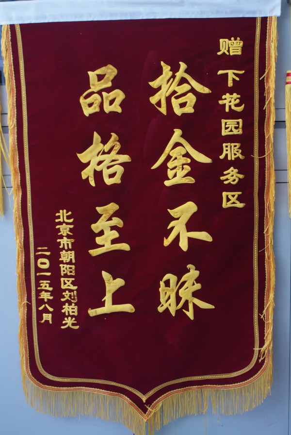 8月4日,北京游客劉先生為京張高速下花園服務(wù)區(qū)送來(lái)一面“拾金不昧,品格至上”的錦旗,向該服務(wù)區(qū)員工表示謝意。