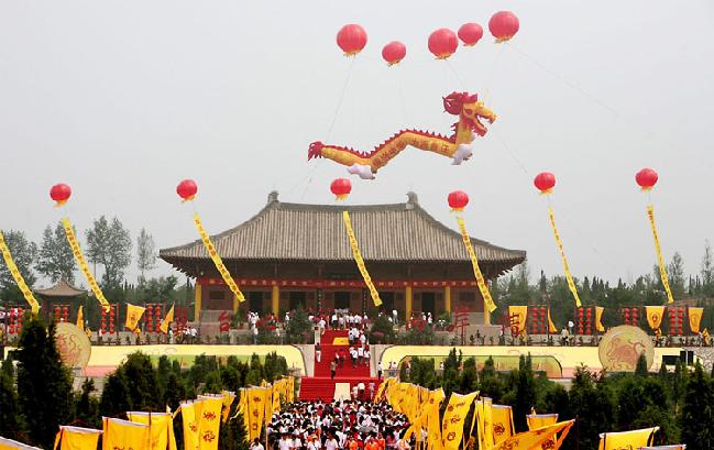 圖片說明:由海外華人捐資興建的中華三祖堂,位于軒轅湖以東,黃帝泉北200米處,是中國黃帝城文化旅游區(qū)的中心景點。三祖堂是一座仿唐建筑,重檐飛角,恢弘壯闊,全部木質(zhì)結(jié)構(gòu)。全堂占地104畝,由平面祭壇、三祖堂、后殿組成。殿內(nèi)三位祖先的塑像姿態(tài)各異栩栩如生,居中的黃帝氣宇軒昂,右側(cè)的炎帝睿智儒雅,左側(cè)的蚩尤勇武彪悍,塑像高6米全部由泥土塑成。大殿四壁繪有涿鹿之戰(zhàn)、阪泉之戰(zhàn)、合符釜山、定都涿鹿四大歷史事件的大型壁畫。
