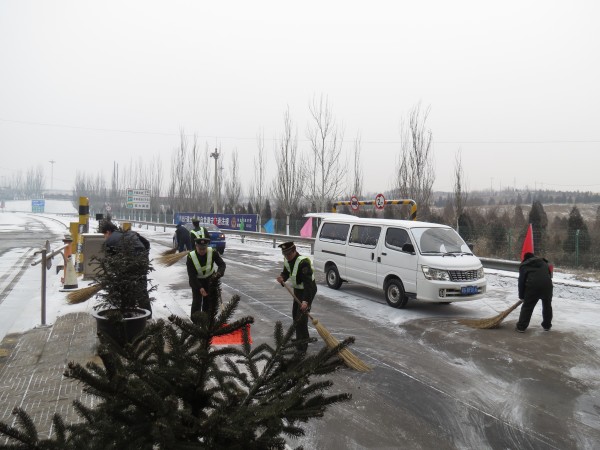早八點鐘,雪還沒有完全停,馮善軍副站長就帶領機電、票證、內務及站區(qū)安保人員來到收費廣場與崗上人員一并投入到了緊張有序的除雪保暢行動中。大家揮舞著手中的除雪工具,不畏嚴寒、不知疲憊。在清除積雪的同時不忘為過往車主做好路況咨詢工作。經(jīng)過大家兩個多小時的努力,收費廣場、車道、安全島等處的積雪清理完畢,為途經(jīng)站口的車輛平穩(wěn)有序的通過提供了安全保障。(下花園收費站 耿海亮)