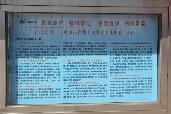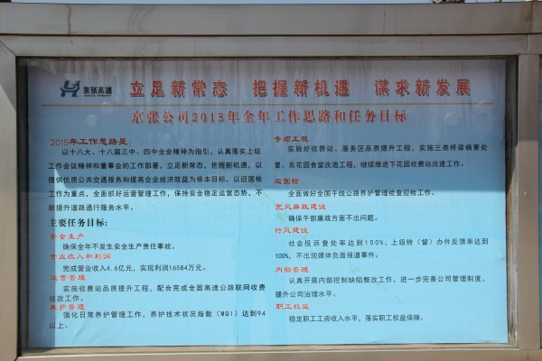 為更好的貫徹公司年度工作會(huì)議精神,總結(jié)上一年工作,分析當(dāng)前形勢(shì),部署新一年各項(xiàng)工作任務(wù),近日,宣化東收費(fèi)站制作公司2015年工作內(nèi)容學(xué)習(xí)展板。展板位于站辦公樓門(mén)口醒目位置,分為兩塊,涵蓋了公司新一年的工作思路、任務(wù)目標(biāo)和運(yùn)營(yíng)管理主要工作等方面內(nèi)容,方便了職工學(xué)習(xí),為宣化東站制定新一年的工作目標(biāo)和任務(wù)提供了參考和依據(jù)。(宣化東收費(fèi)站 趙海濤)