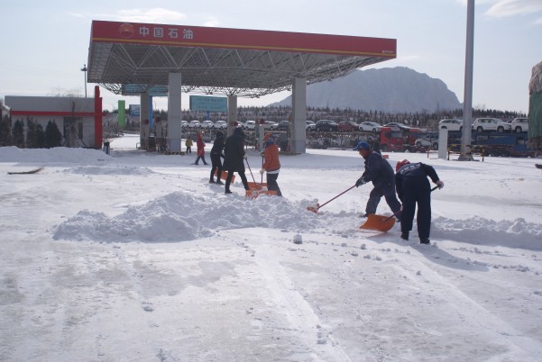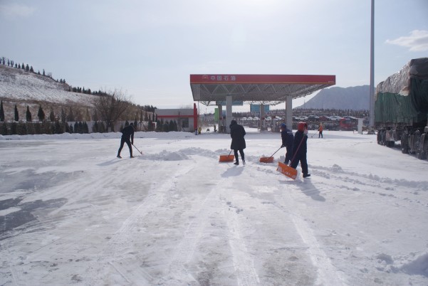 在寒冷的天氣中,各部門員工不懼寒冷,積極除雪,經(jīng)過了3小時的清掃,將進出站口、加油站、餐廳、超市、衛(wèi)生間、以及廣場的積雪都清理了干凈。