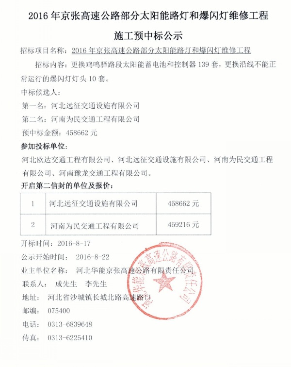 2016年京張高速部分太陽能路燈和爆閃燈維修工程施工預(yù)中標(biāo)公示