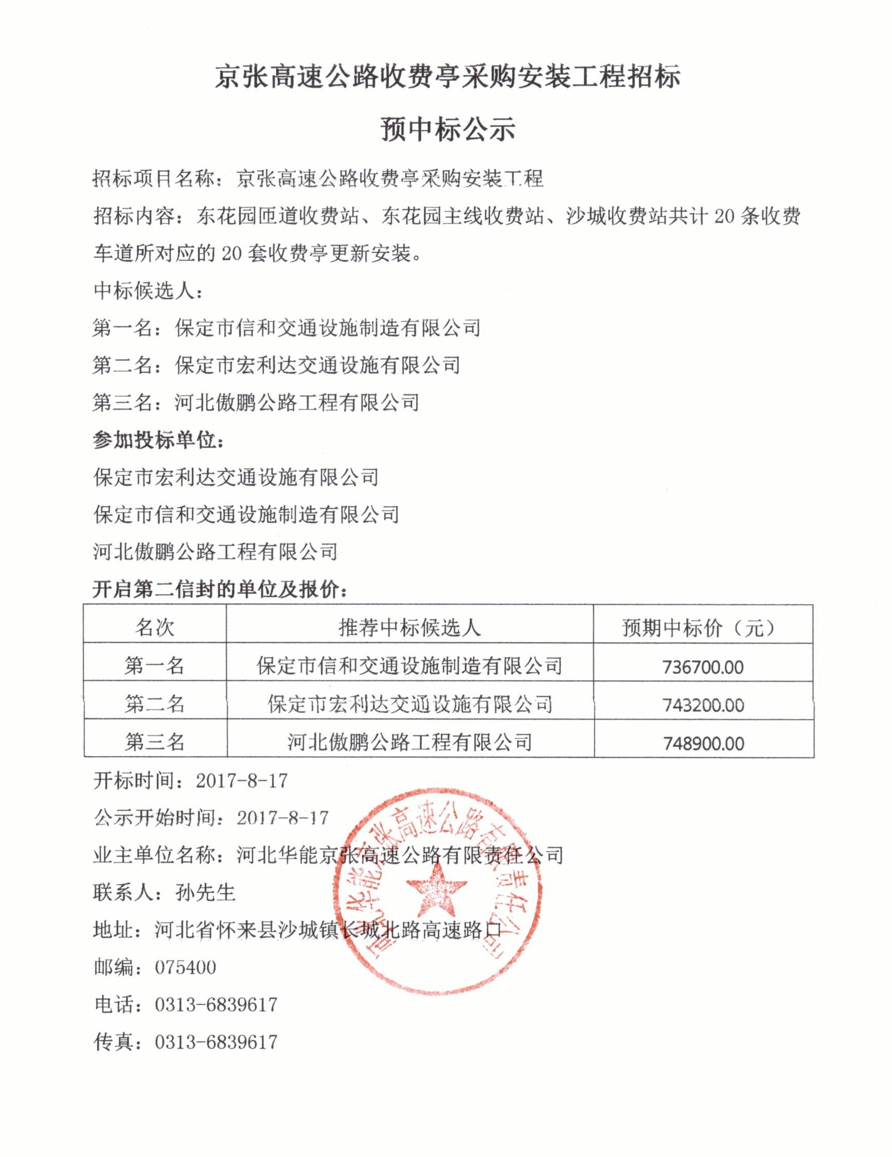 京張高速公路收費(fèi)亭采購安裝工程招標(biāo)預(yù)中標(biāo)公示
