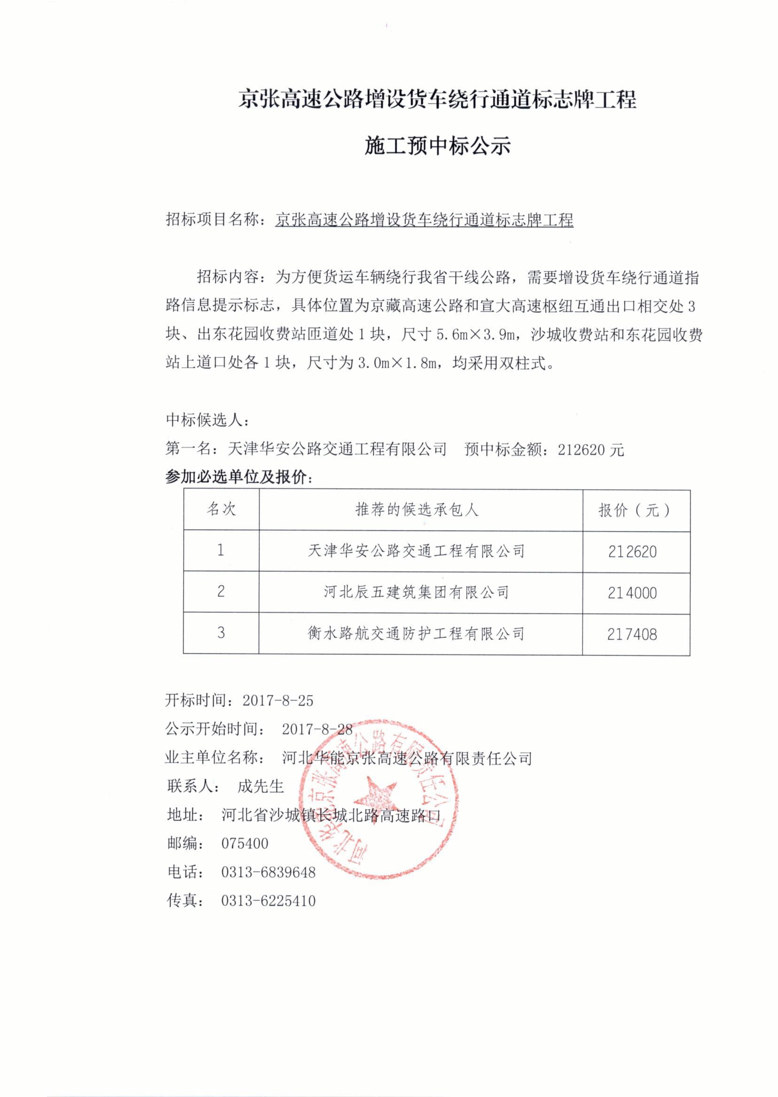 京張高速公路增設(shè)貨車(chē)?yán)@行通道標(biāo)志牌工程施工預(yù)中標(biāo)公示